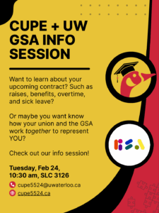 We are happy to announce that the EGSA and CUPE 5524 will be hosting a joint info session for all graduate students! This will be your chance to learn about the union, ask questions, meet your representatives, and get your voice heard for concerns you have faced on campus and at Waterloo.